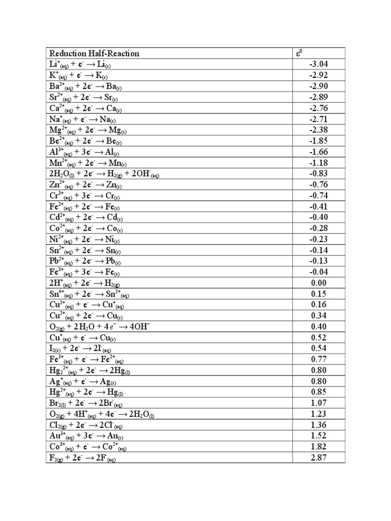 Standard Reduction Potentials Data MsWord